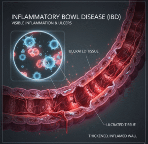 👉 This is IBD. It is a disease with visible inflammation and damage to the bowel, needing long-term treatment and monitoring.