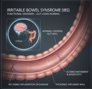 👉 This is IBS. It is a functional disorder—the gut looks normal, but its movement and sensitivity are altered.