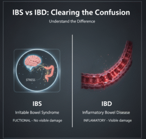 When it comes to gut problems, two names often cause worry—IBS (Irritable Bowel Syndrome) and IBD (Inflammatory Bowel Disease). The names sound similar, but the conditions are very different. Many people search online and get terrified, mistaking one for the other. Let’s simplify this with examples and real-life stories.
